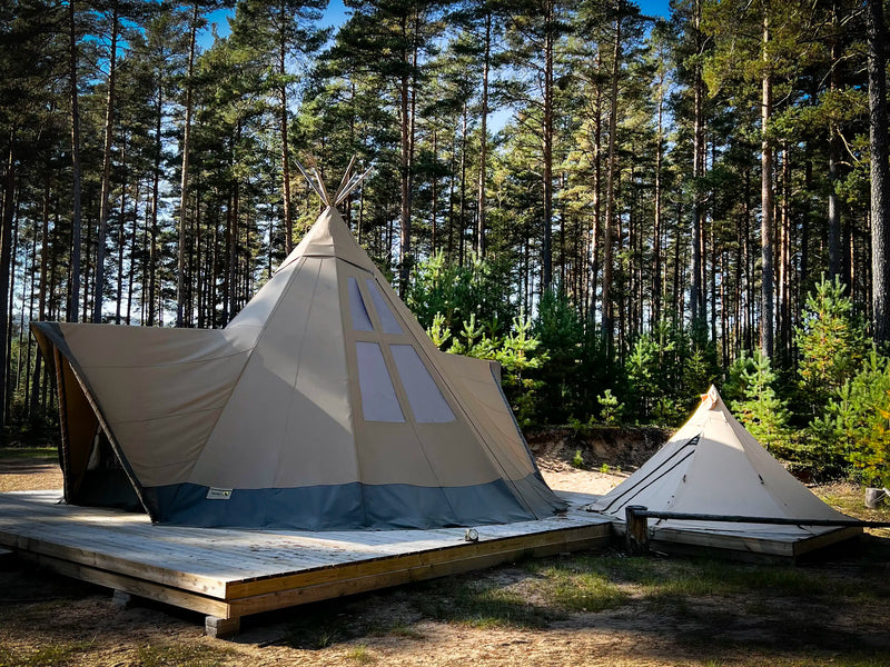 När Harold och Mariska ville erbjuda något mer än traditionella campingplatser och stugor, föll valet på en glampinglösning som smälter in i den naturnära miljön. På en träplattform i skogen restes deras första tältkåta, en Aurum 33, inredd med dubbelsäng, kök, matplats och en mysig sittgrupp. På samma plattform placerades även en mindre tältkåta, Olivin 2, som extra sovplats och ett roligt krypin för barn. Satsningen blev en succé. ”Det handlar helt och hållet om upplevelsen,” säger Harold.