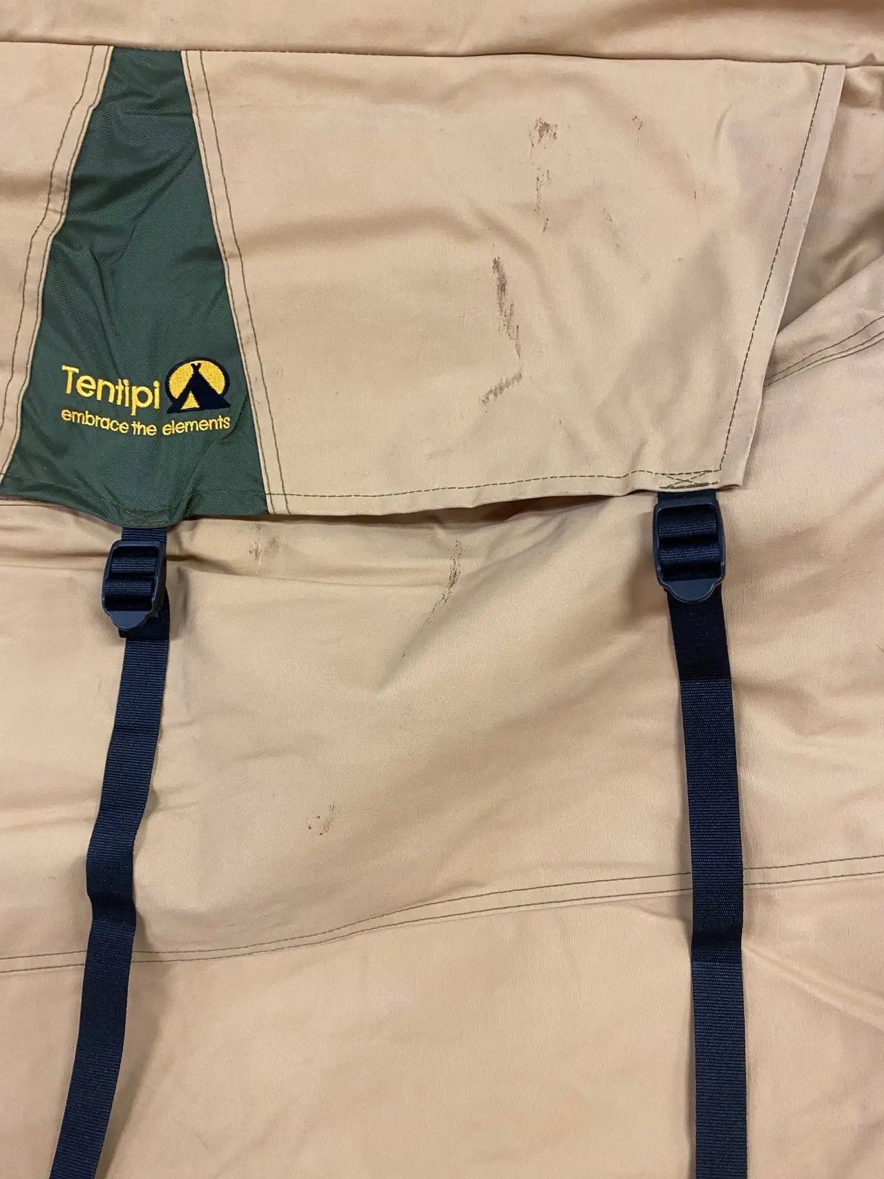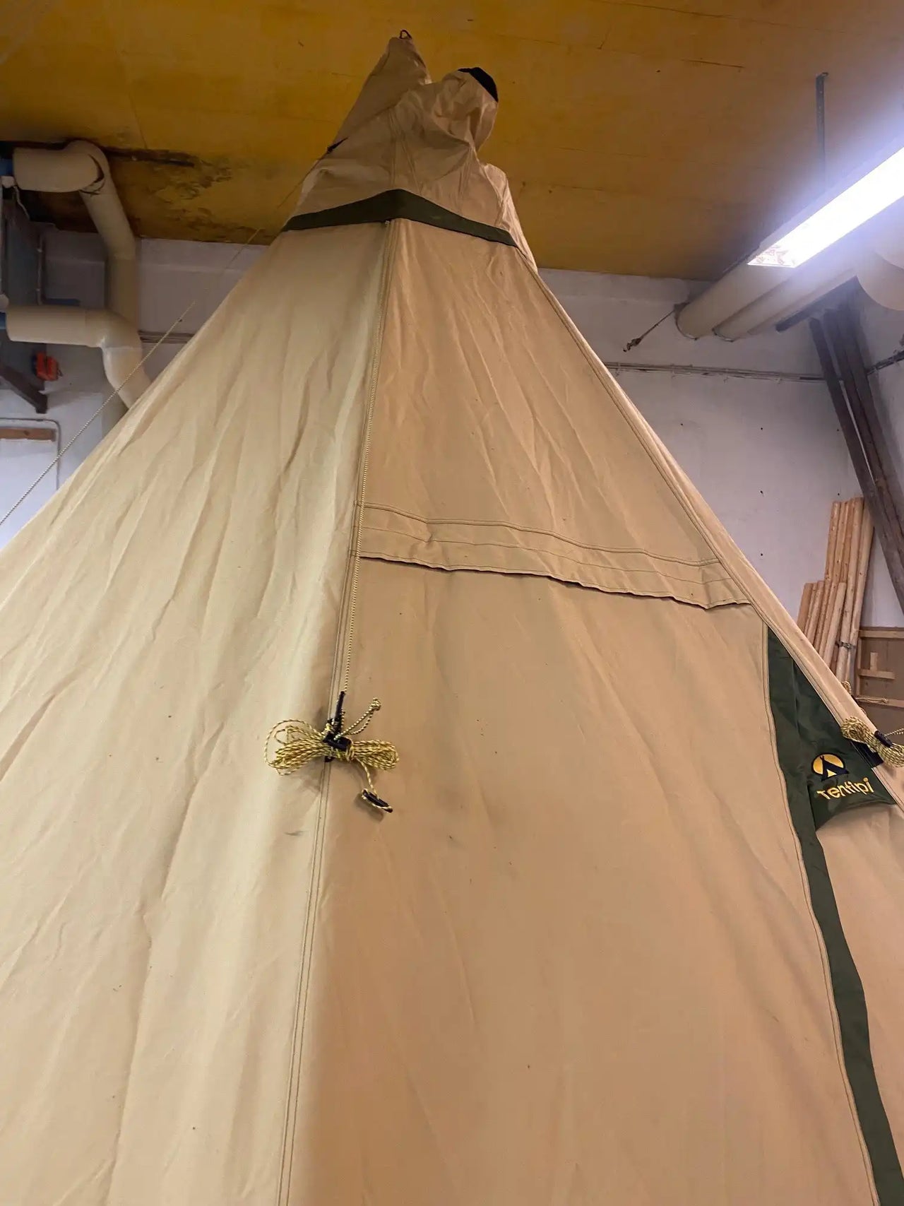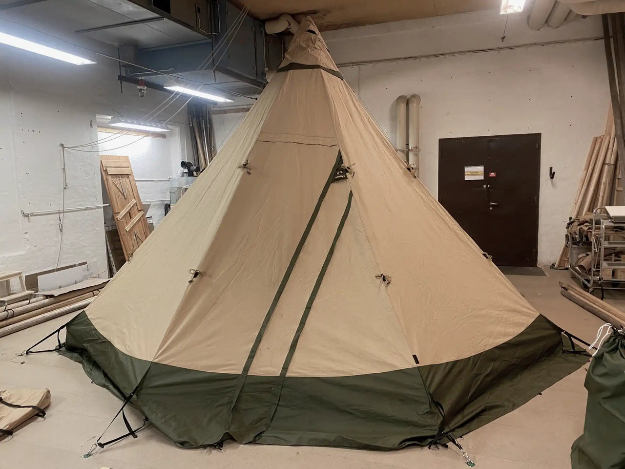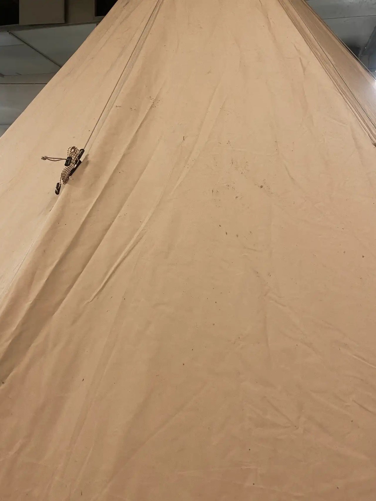 Nordic tipi in good condition, used daily over a two-week period. A stove was used daily inside the tent, which has resulted in soot marks visible at the top.