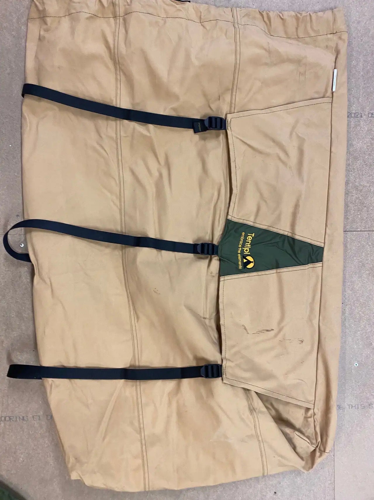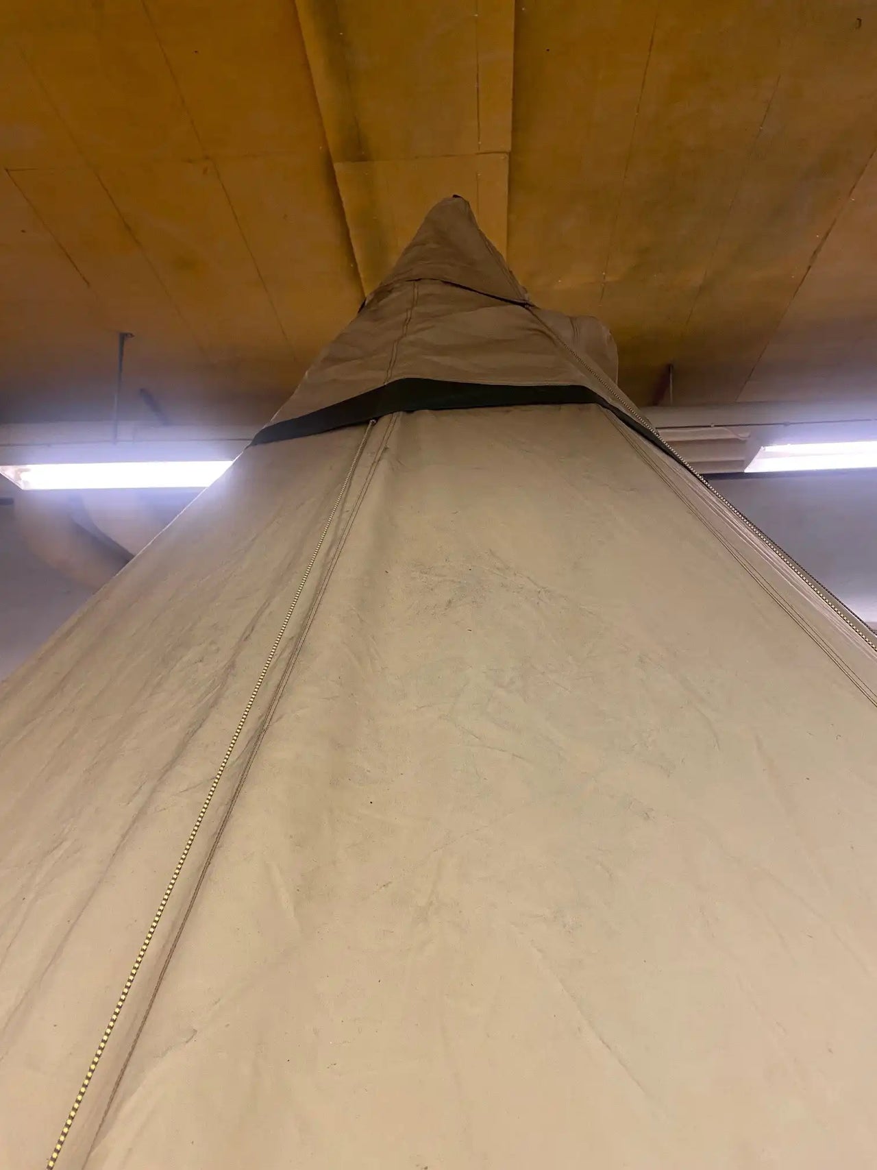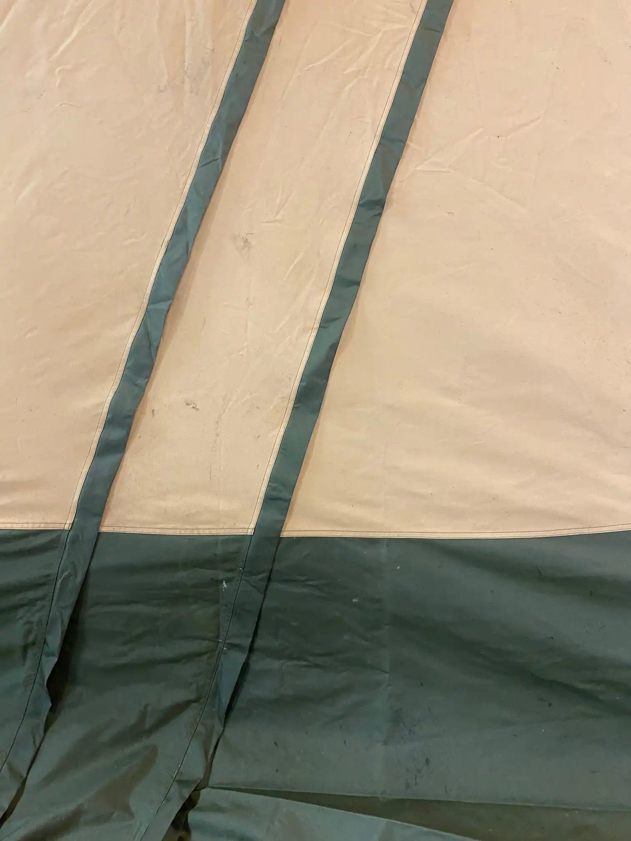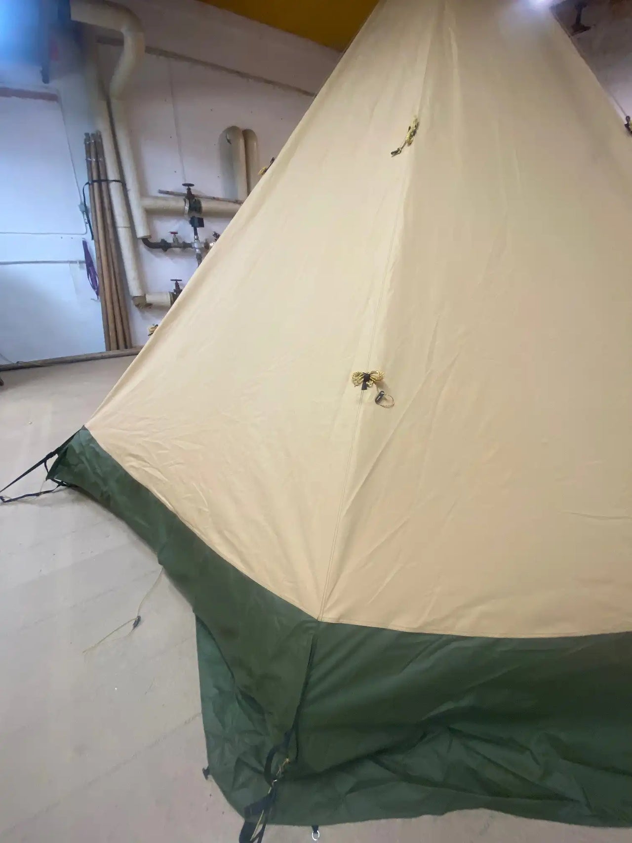 Nordic tipi in good condition, used daily over a two-week period. A stove was used daily inside the tent, which has resulted in soot marks visible at the top.