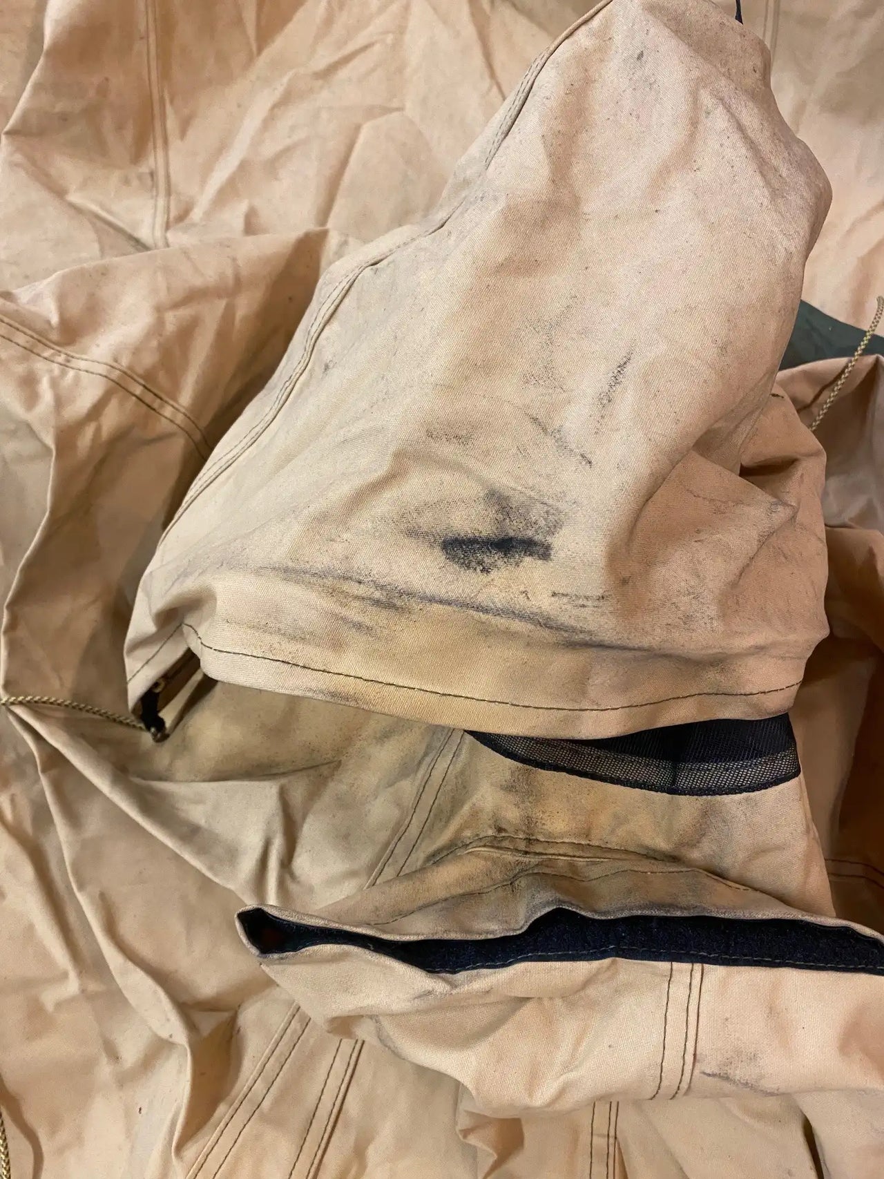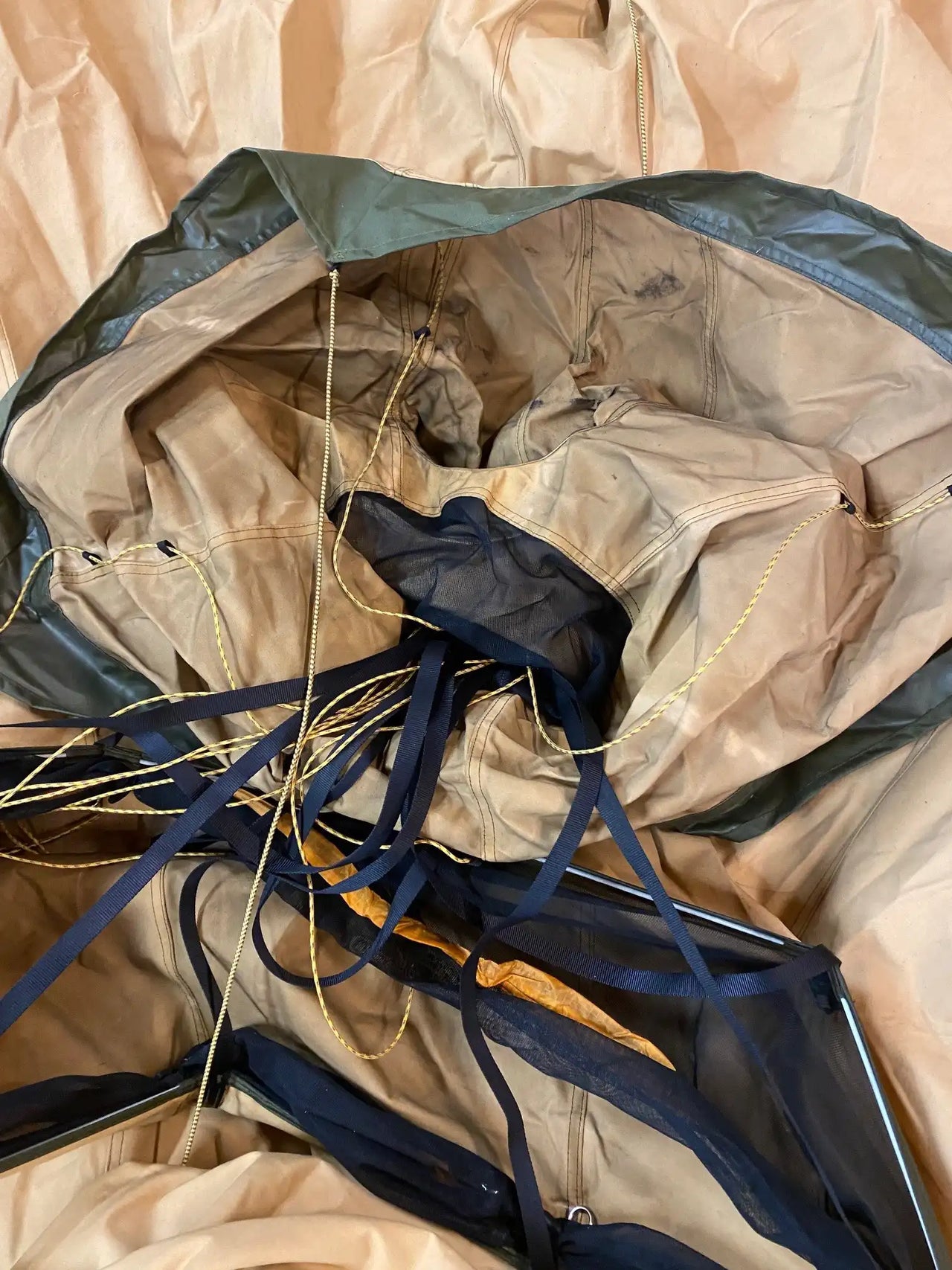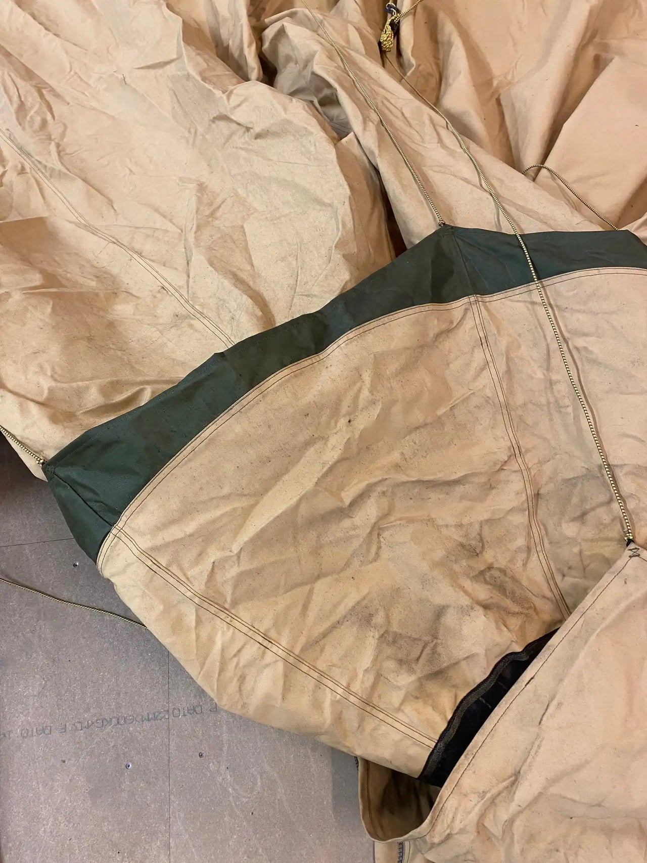 The exterior also shows some traces of fallen soot in the form of spots and specks. Otherwise, the tent is in good condition, with some panels showing varying amounts of soot or dirt.