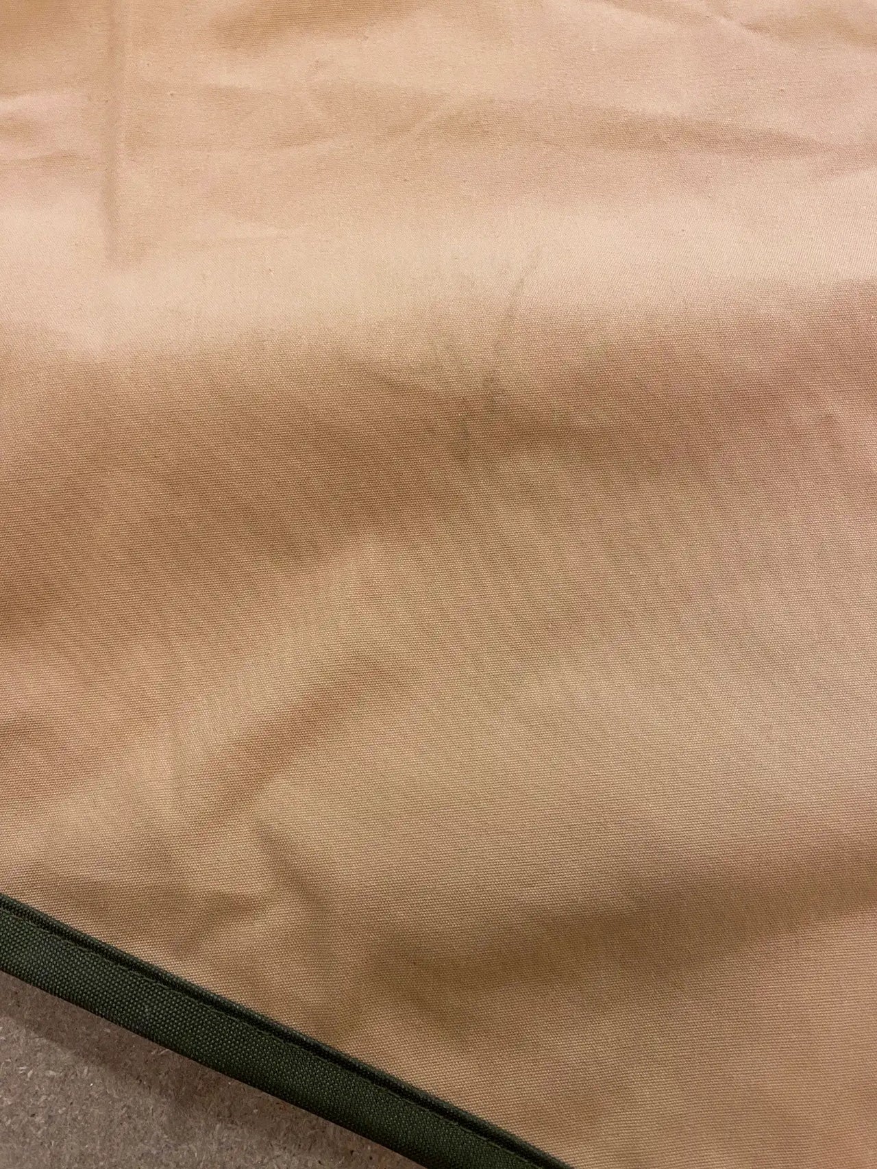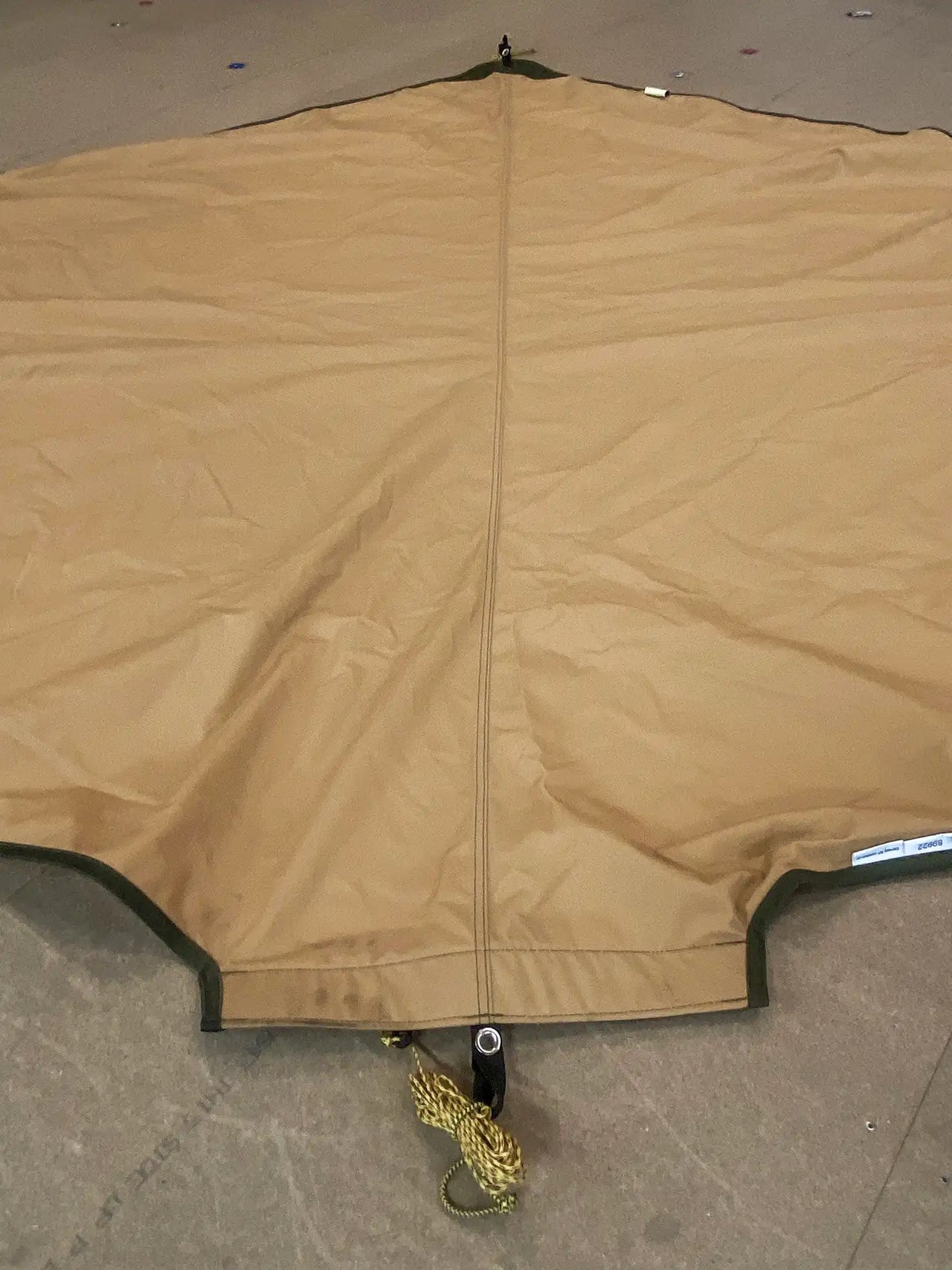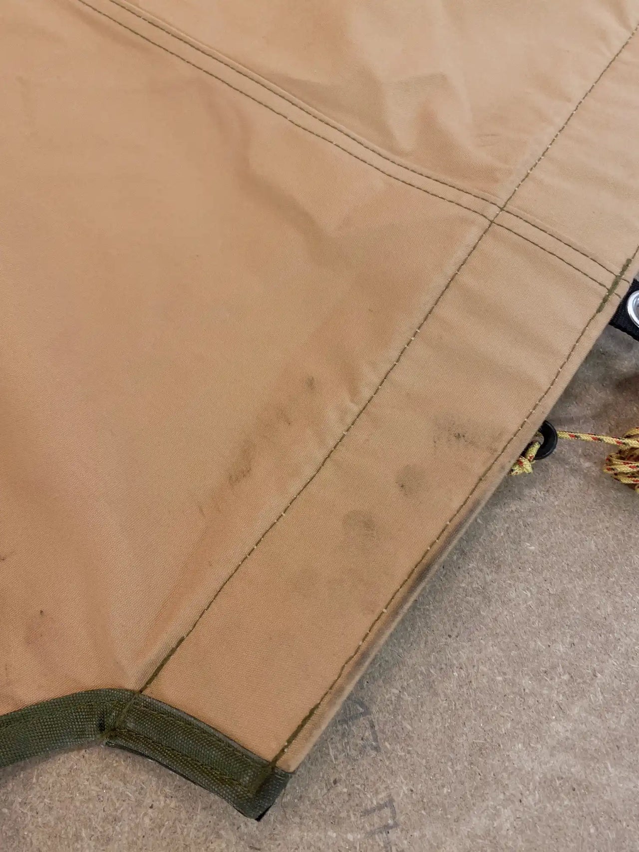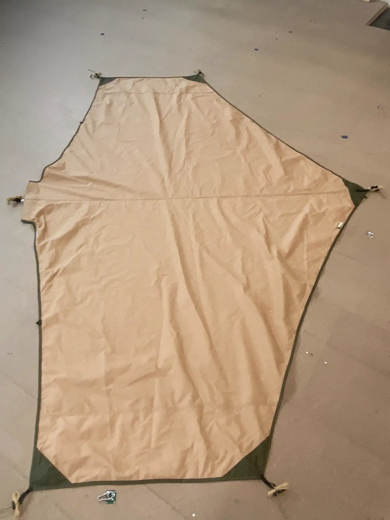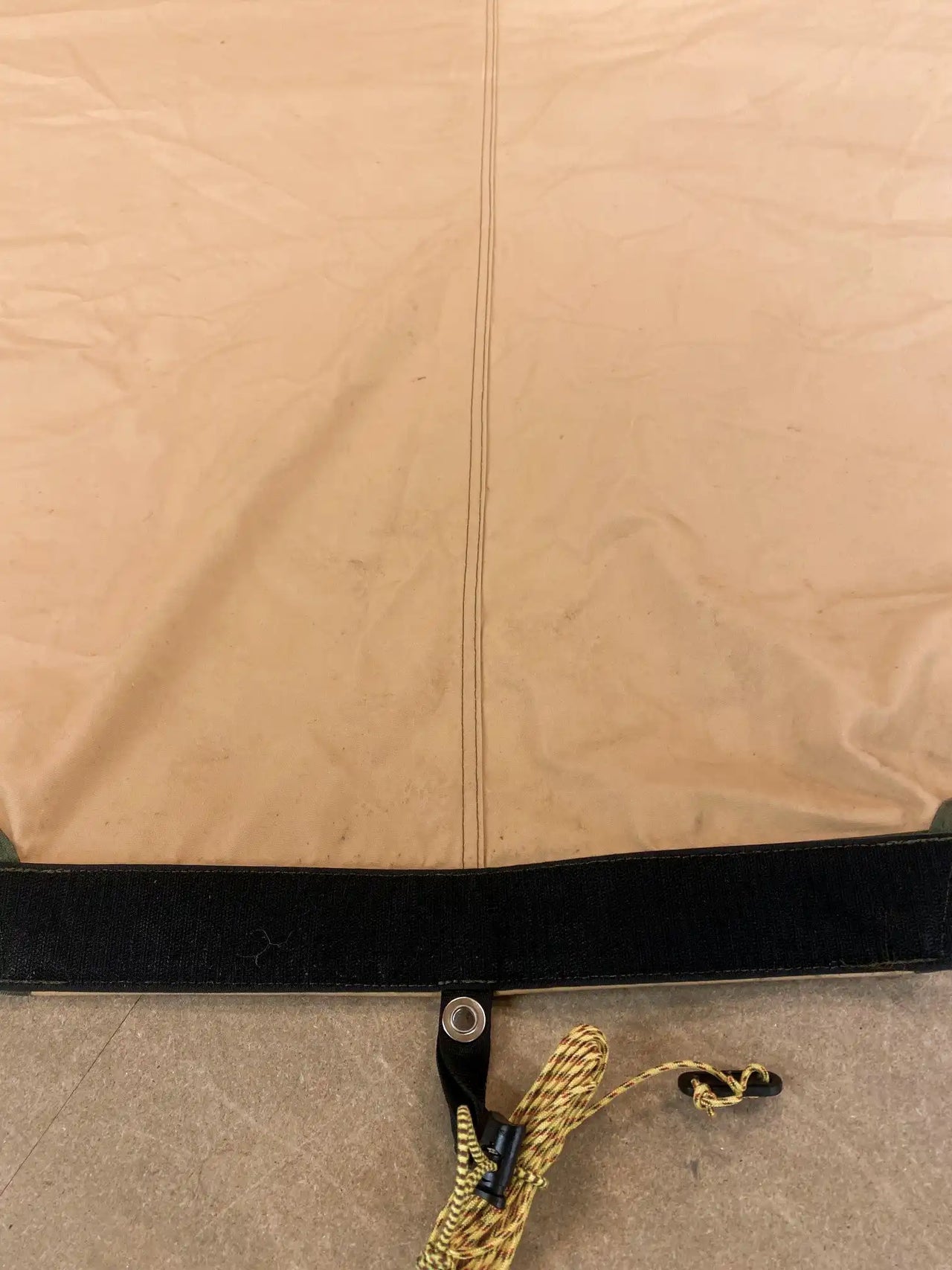 Canopy in very good condition, briefly used outdoors for demo purposes with a lit stove. The top side has minor soot and dirt marks. The underside has a small dirt spot and traces of sooty fingers near the Velcro. Comes with brand-new pegs.
