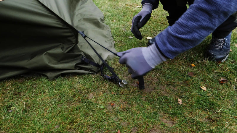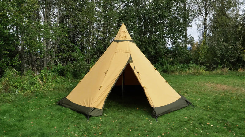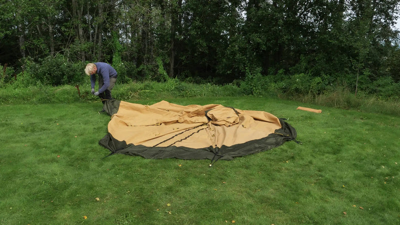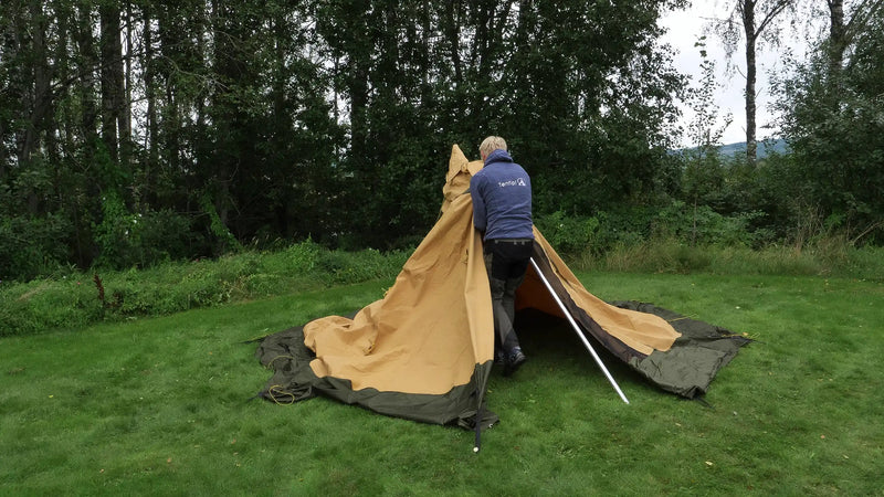 Stäng dörren och sträck marksträckarna lite i taget runt om tältet. Ta ett steg tillbaka och se om tältkåtan står symmetriskt. Sträck sedan det sista på marksträckarna så att tältduken är ordentligt sträckt.