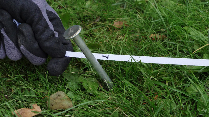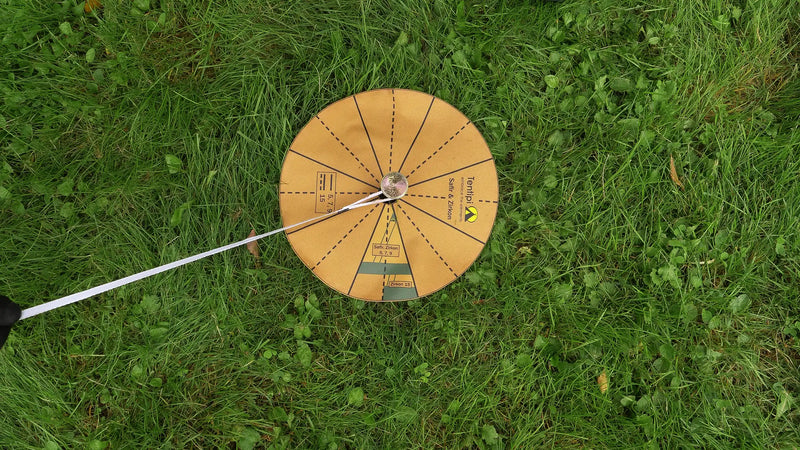Placera monteringskrysset där mittstången ska stå. Trä mätlinan runt spiken och dra ut den till markeringen på linan. Där sätter man spiken. Se till att linan är sträckt och följer monteringskryssets linjer.